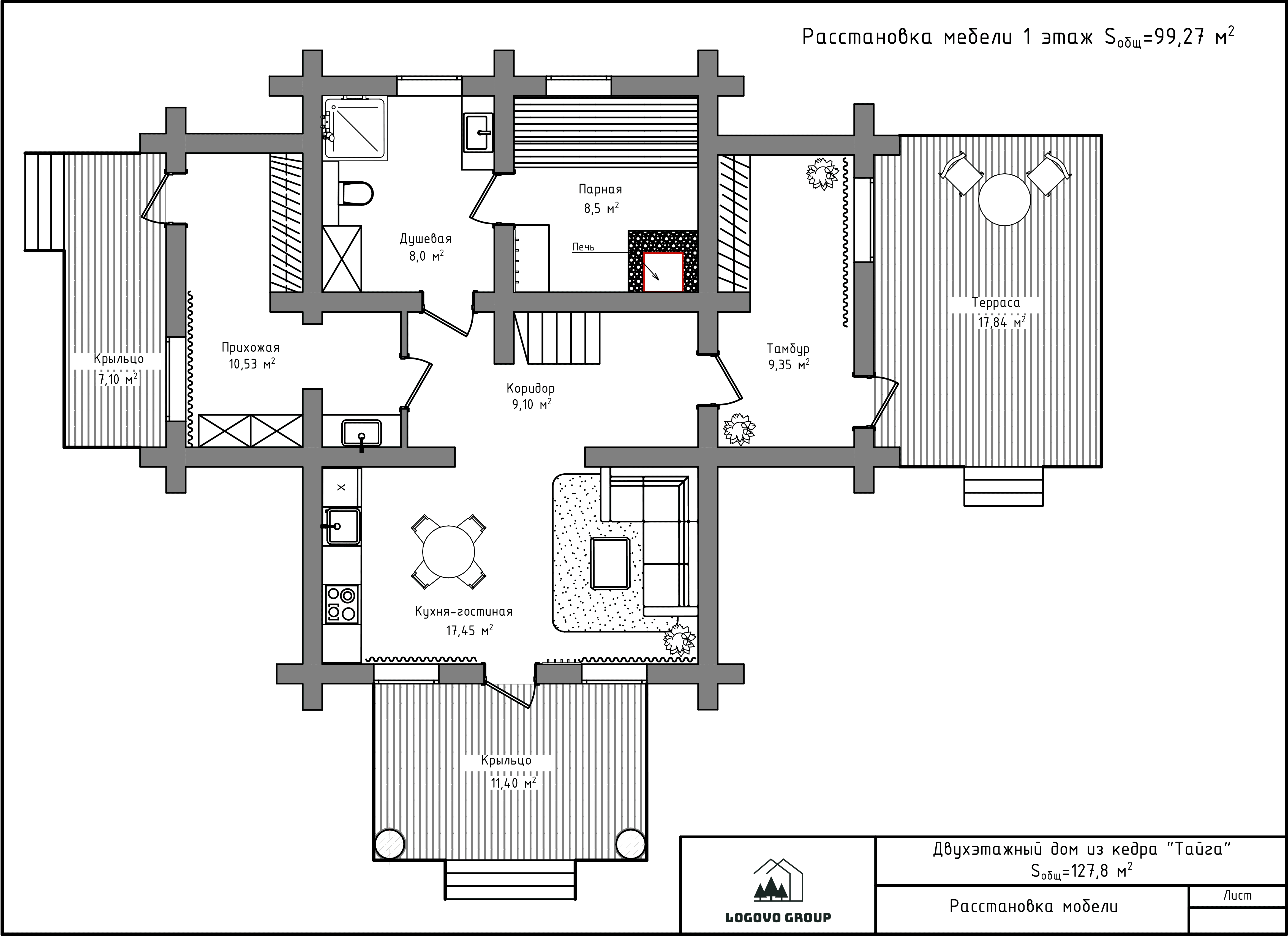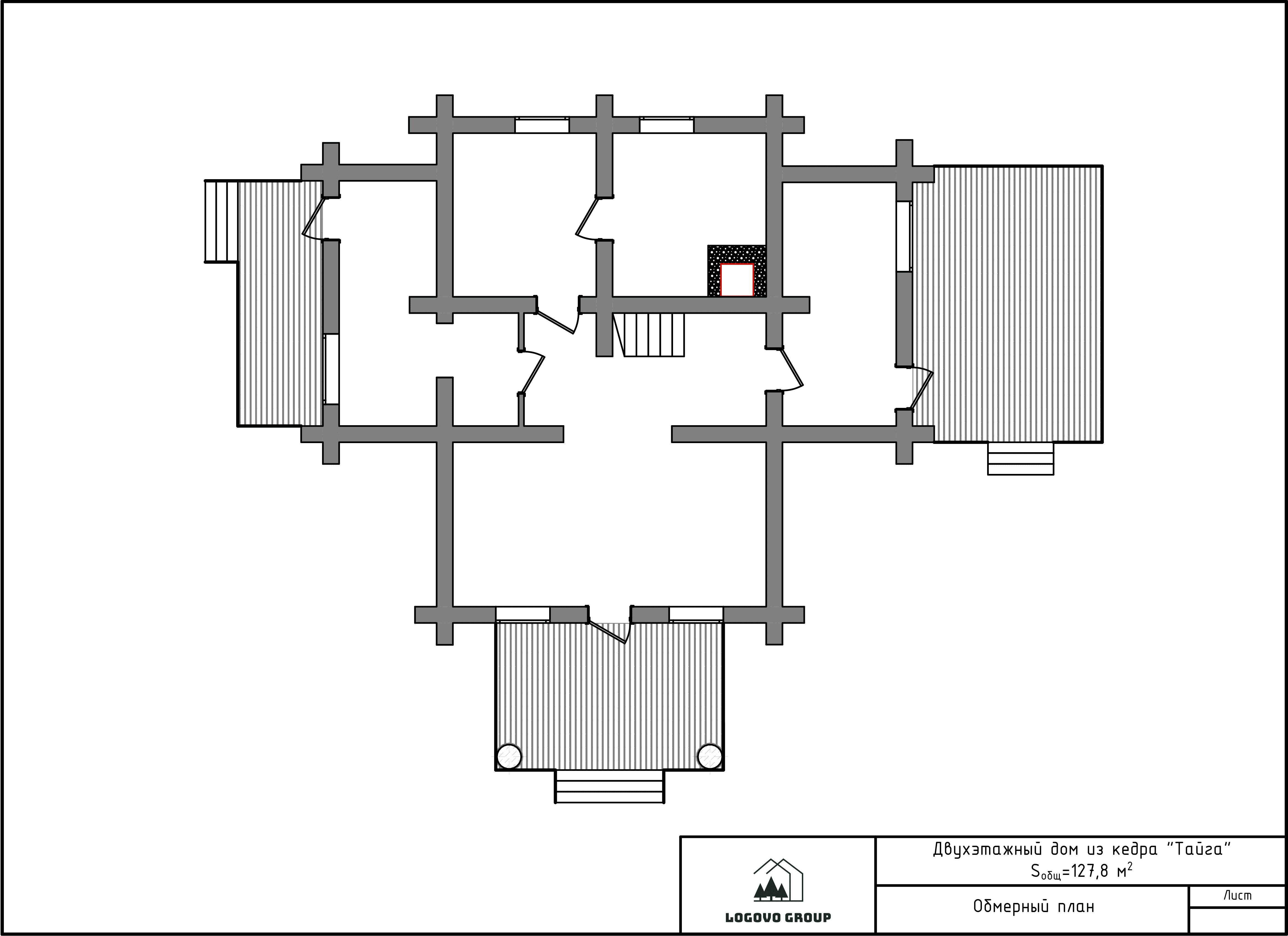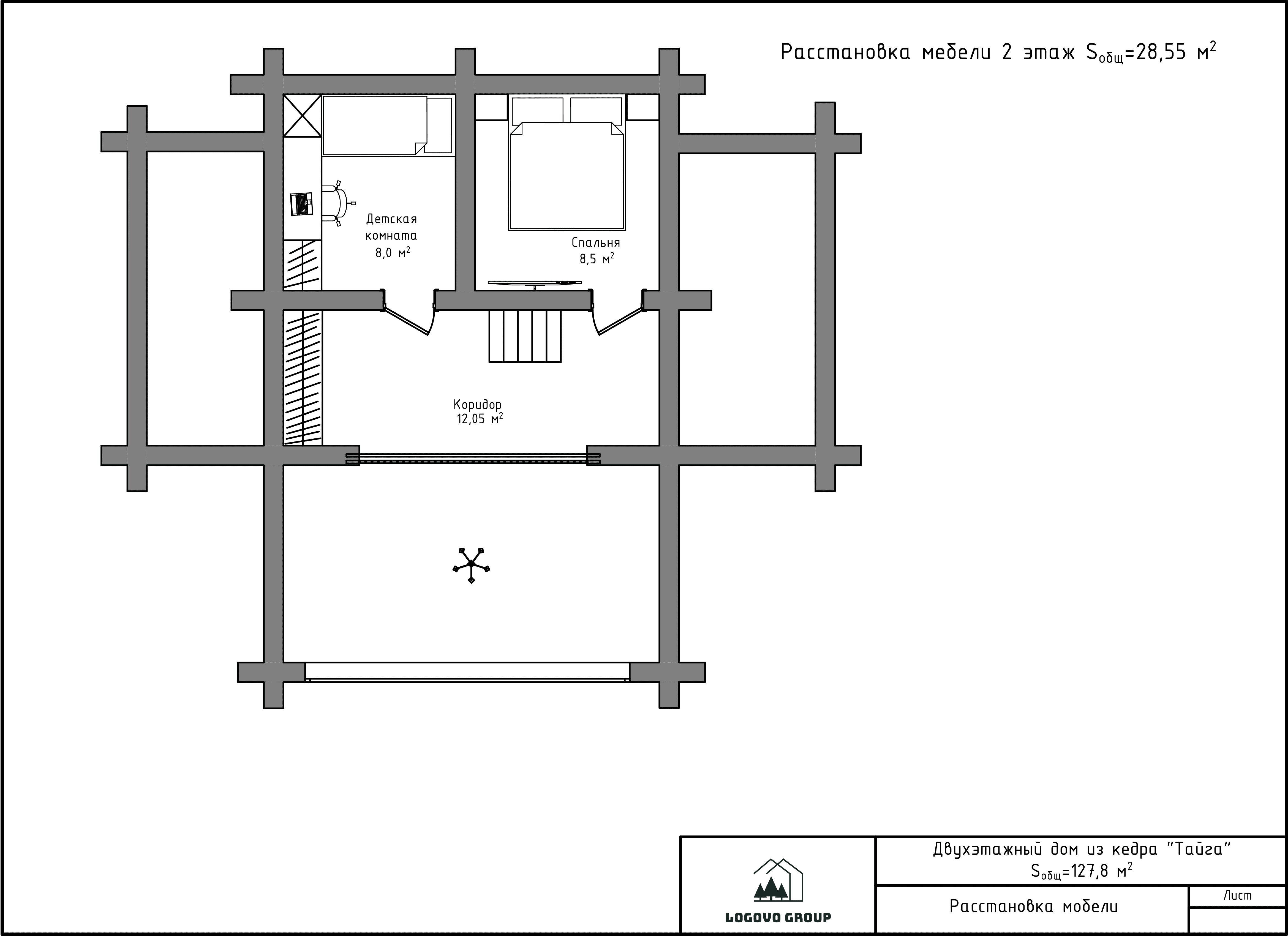 Представляем вашему вниманию проект деревянного двухэтажного дома площадью 127 квадратных метров, выполненного из кедрового сруба по технологии канадской рубки.